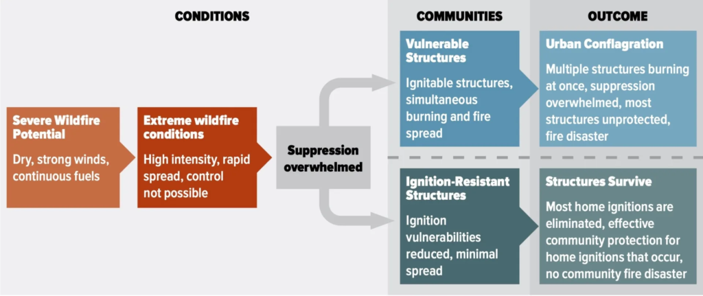 (Above) The Wildfire Disaster Sequence: severe wildfire potential and extreme conditions will quickly overwhelm wildfire suppression resources. Vulnerable structures will ignite and lead to an urban conflagration and fire disaster. Structures built to be ignition-resistant are more likely to survive and can interrupt the disaster sequence. Leading wildfire experts make the case that creating wildfire-resistant […]